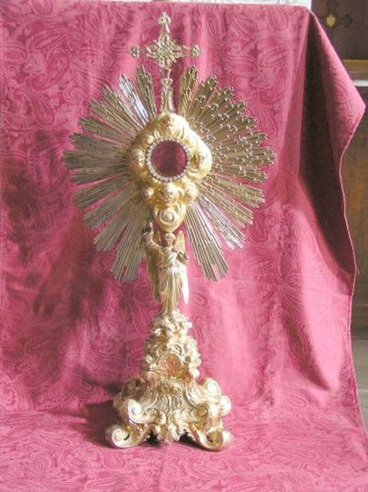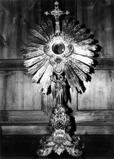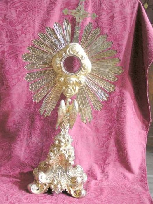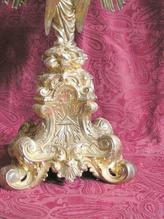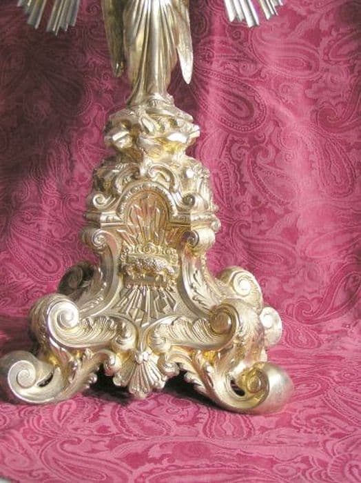 Ostensoir en vermeil de deux couleurs, socle de rocailles, ange à la tige, lunule entourée de pierres de cristal taillé.