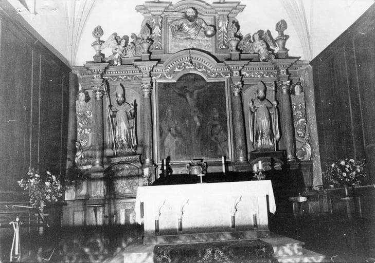 Retable en bois doré avec panneau central représentant la Cruxifixion. De chaque côté, entre deux colonnes cannelées, à chapiteaux corinthiens, statues de deux évêques en bois doré. Près du mur de la nef, têtes d'anges au-dessus de volutes et pampres. Au-dessus du panneau central, buste de Dieu sortant des nuages et tenant le monde. De chaque côté, un ange déployant ses ailes.