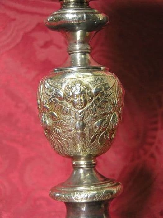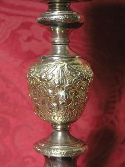 Calice en argent, pied bordure ajourée, noeud avec fruits et tête d'anges, coupe unie en argent doré. Patène en argent et vermeil.