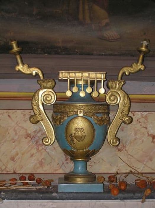 En forme d'amphore, avec anses et volutes. Vase surmonté du livre aux sept sceaux. Croix au pied de forme pyramidale à trois supports au-dessus du livre. Deux coeurs flamboyants sur le ventre du vase, enlacés d'une couronne d'épines. Anses surmontées de bois tourné supportant quatre chandeliers.