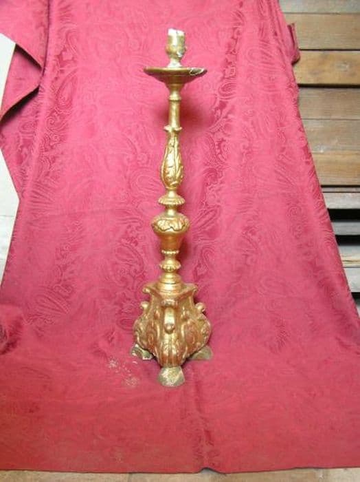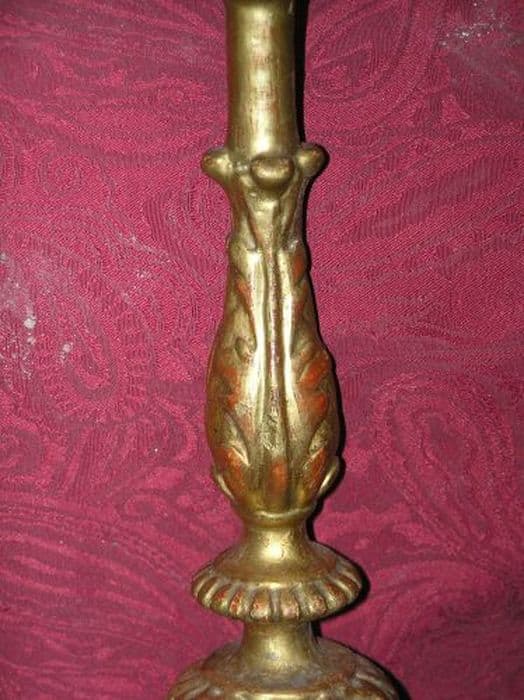 Socle à trois pieds, faces triangulaires du socle pyramidal ornées d'un cartouche fleuri. Pied avec renflement continué par tiges de fleurs fermées et bobèche en bois mince.