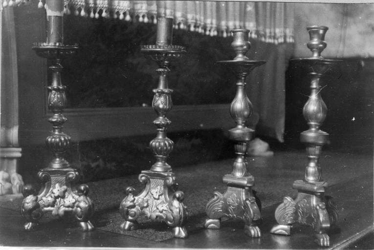 Quatre chandeliers, socles à trois pieds, dont les faces sont ornées de fleurs gravées à quatre pétales, montants ornés d'un renflement en forme de tulipe fermée gravée, bobèches gravées de pétales sous la face intérieure. Quatre autres chandeliers plus hauts que les précédents, socles pyramidaux à trois pieds ornés de feuillages et sur les faces de trois fleurs à quatre pétales en relief assez accusé, montants ornés de renflement à cannelures, renflement en forme de fleur ouverte, bobèches très épaisses ornées en-dessous de cannelures.