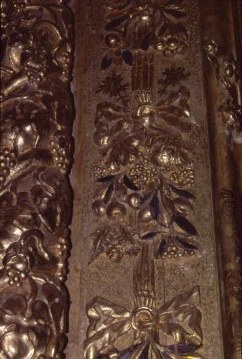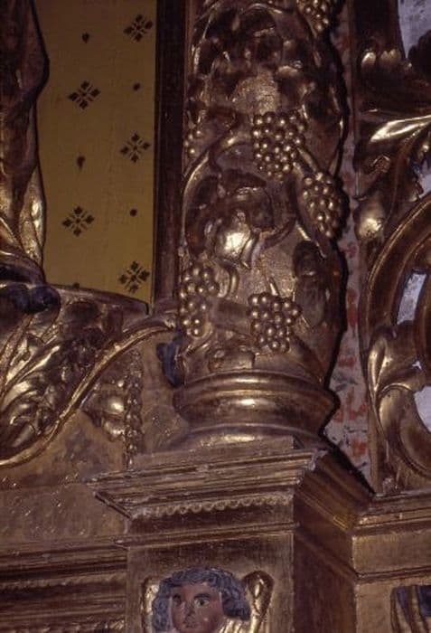 Registre inférieur : deux panneaux illustrés avec à droite, la Visitation et à gauche, l'Annonciation et au centre, un panneau simplement orné de floraison, registre supérieur : trois panneaux, avec à droite, la statue de Jésus Christ, au centre, une peinture de la Vierge de gloire, à gauche, une statue de la Vierge. Les panneaux sont placés entre quatre colonnes torsadées, ornées de feuillages.