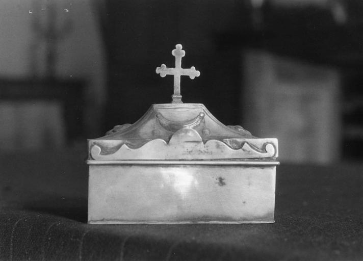 Chrémeau de forme rectangulaire. Couvercle de forme pyramidale surmonté d'une croix tréflée.