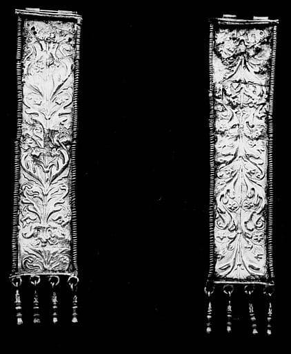 Soie blanche à galons de drap d'or, sur les côtés, rinceaux brodés. L'étoffe du haut de la coiffe est sernée de petits croissants.