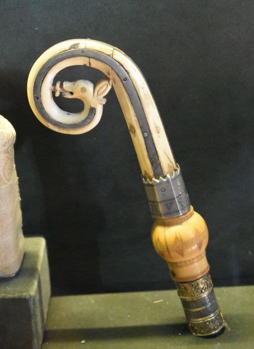Crosse en ivoire. Tige octogonale ornée de petits cercles en creux, emboîtée dans une gaîne d'argent. Bâton en bois portant trois anneaux d'argent, dont deux sont dorés.