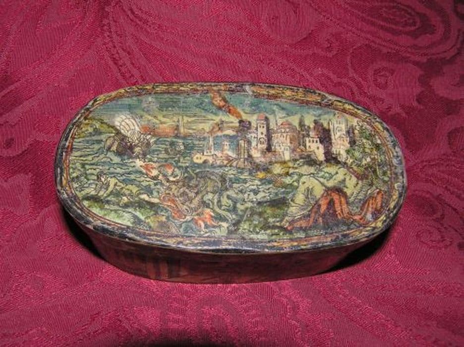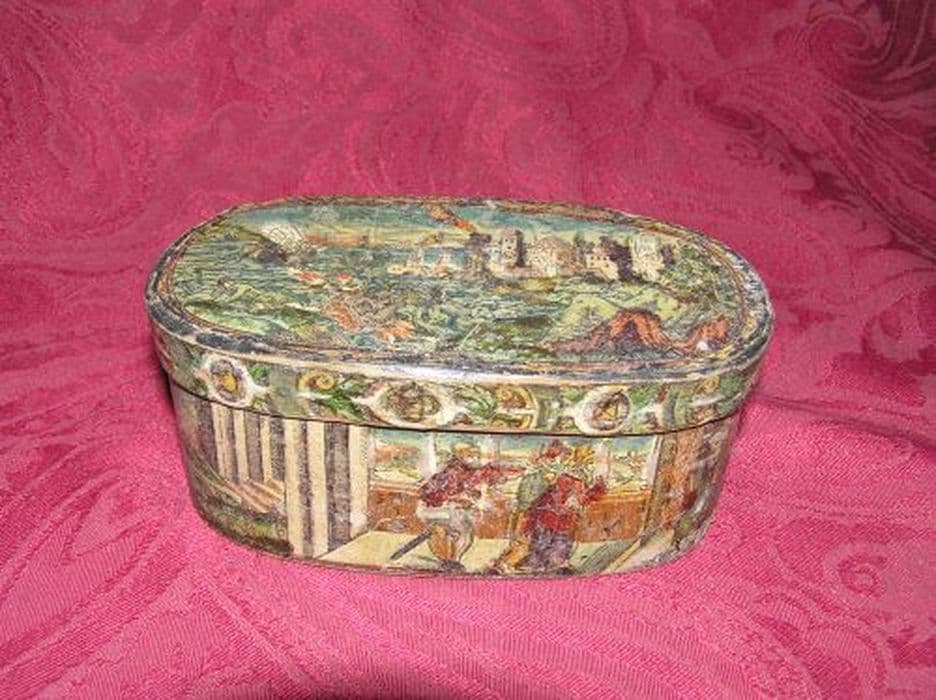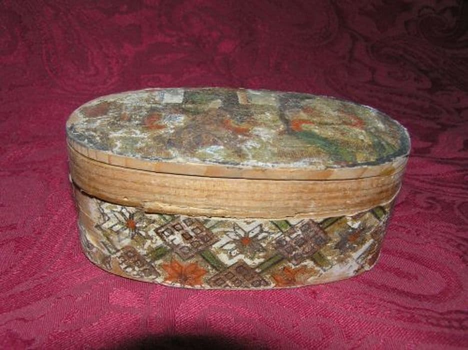 Boîtes ovales en lamelles de bois à décor de gravures collées et coloriées : la Trinité, deux femmes assises, Histoire de Jonas (couvercle) et Histoire de Suzanne (sur les côtés).