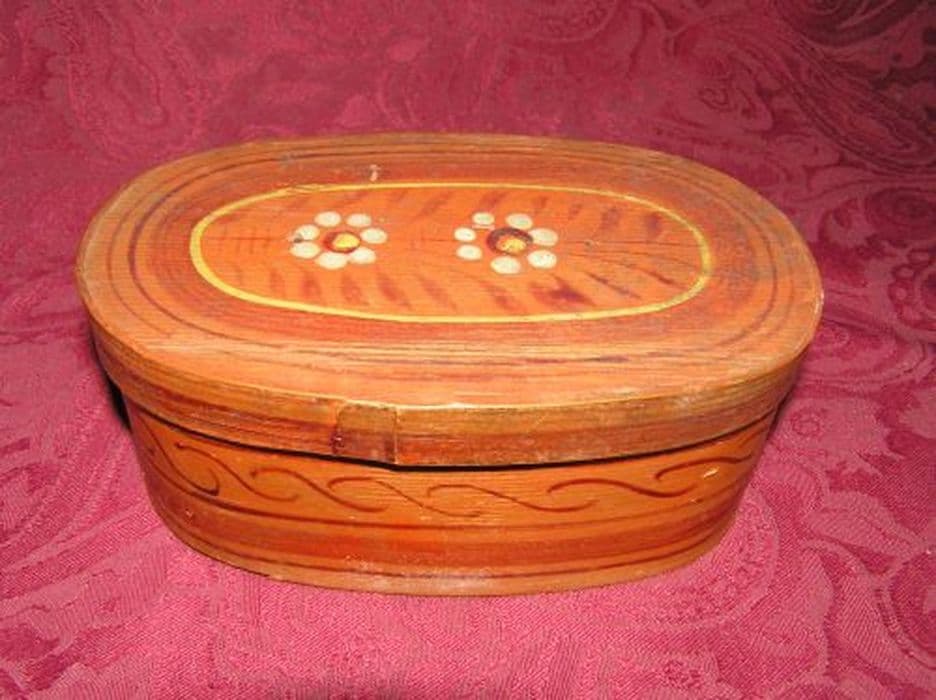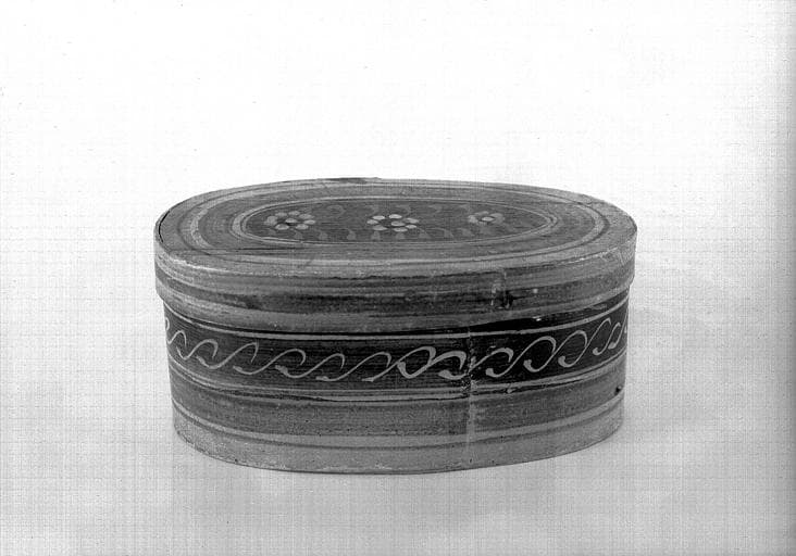 Boîtes ovales en lamelles de bois peint à décor de bandes et de fleurettes.
