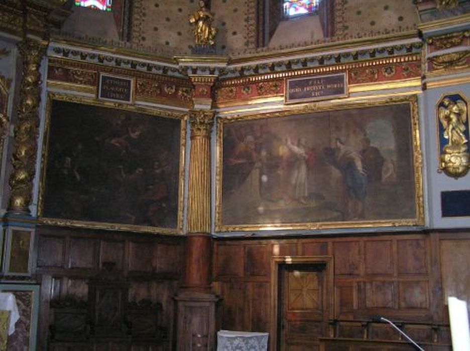 Choeur à cinq pans ornés de colonnes torses et de statues en bois doré. Une toile dans chaque pan du choeur.
