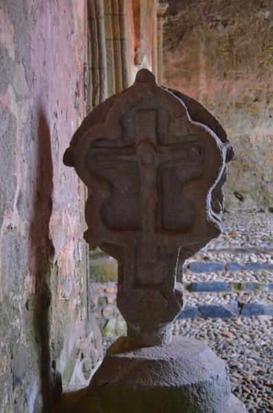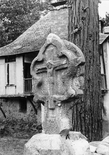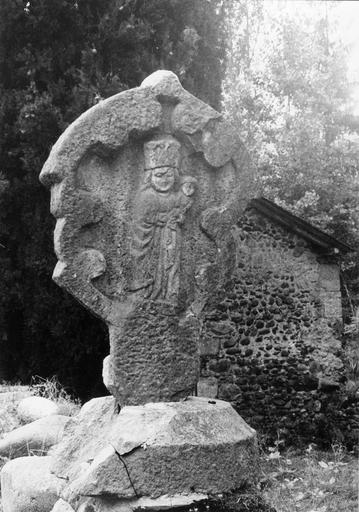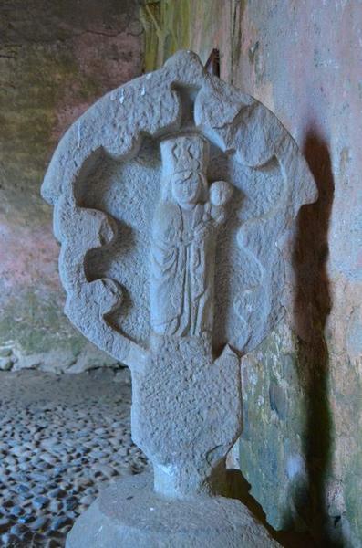 Croix en pierre de grès bleuté sculptée portant sur une face le Christ en croix et sur la face opposée la Vierge à l'Enfant. Sur cette face la Vierge porte une haute coiffure qui paraît être une couronne, l'enfant tenu sur le bras gauche, est longuement vêtu. Le Christ est naïf, tête penchée à droite et longue chevelure, bras horizontaux ressemblant un peu au Christ en bois du 15e qui se trouve à l'intérieur de l'église. Les deux personnages sont dans une sorte de gloire formée par un bourrelet en relief de la pierre de forme pentagonale pour le Christ et plus découpée pour la Vierge.