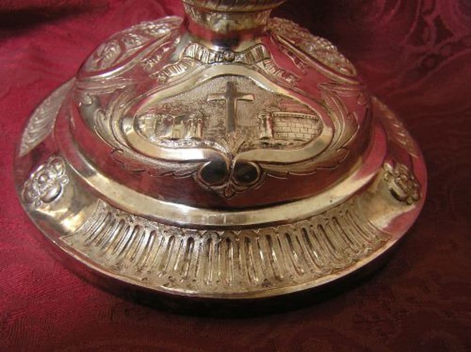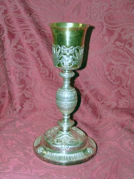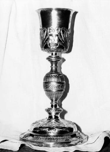 Calice argent à coupe dorée. Fausse coupe ajourée à noeuds de rubans blé et vigne, noeud ovoïde cannelé, croix au pied.