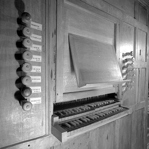 La console, en fenêtre, comporte deux claviers manuels (grand orgue, 8 jeux ; récit, 4 jeux) et un pédalier à la française.