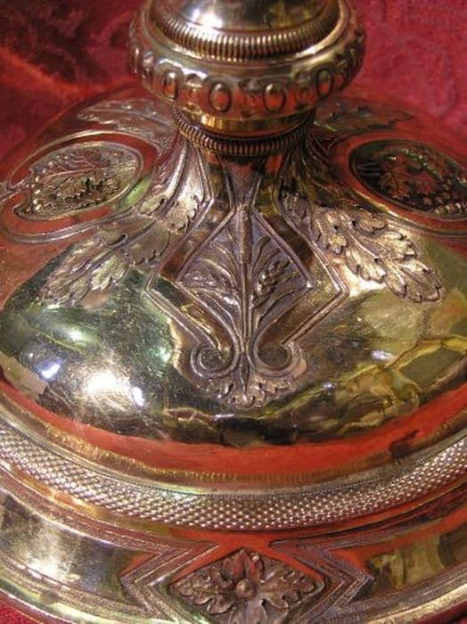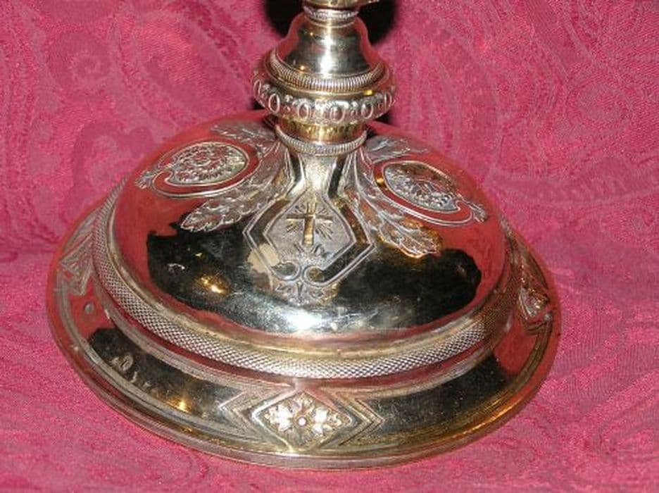 Pied circulaire au redent concave chargé de quatre cartouches vierges alternant avec quatre rosaces dans un losange. Dessus bombé orné de deux cartouches baroques en forme de losange, abritant une croix latine fichée rayonnante, une composition formée d’une masse de roseau et de deux épis de blé, et deux médaillons ovales enserrant une grappe de raisin feuillée, alternant avec des feuilles d’acanthe stylisées, l’ensemble bordé d’un ruban. Collerettes basse et haute perlées. Noeud en forme d’urne décorée de feuilles d’acanthe et chargé de deux cartouches baroques en forme de losange, abritant une composition d’une masse de roseau et de deux épis de blé et deux médaillons ovales enserrant une grappe de raisin feuillée, alternant avec des feuilles d’acanthe stylisées. Fausse coupe ajourée à feuilles d’acanthe alternant avec trois médaillons ovales abritant : un buste de Christ aux outrages, un buste de Vierge Marie, un coeur enflammé entouré d’une couronne d’épines, le tout sommé d’une croix latine. Coupe à bord évasé.