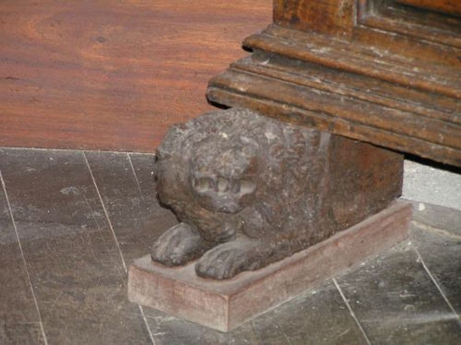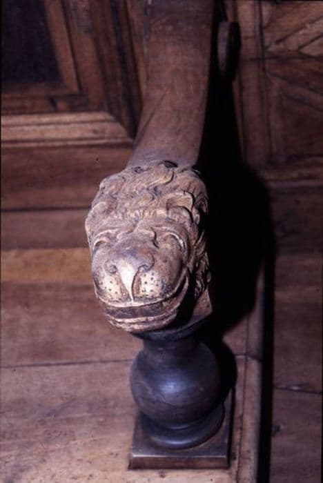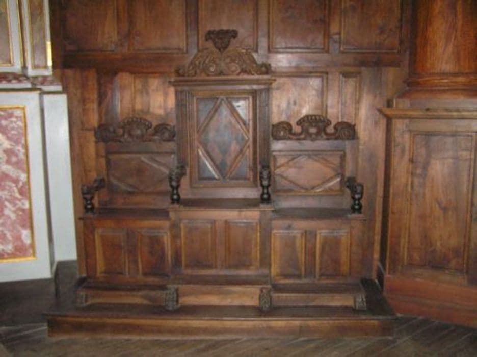 Banc d'oeuvre en noyer sculpté de cartouches et de panneaux en bas-relief.