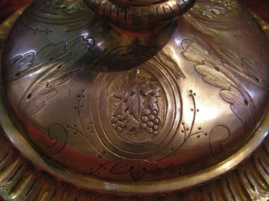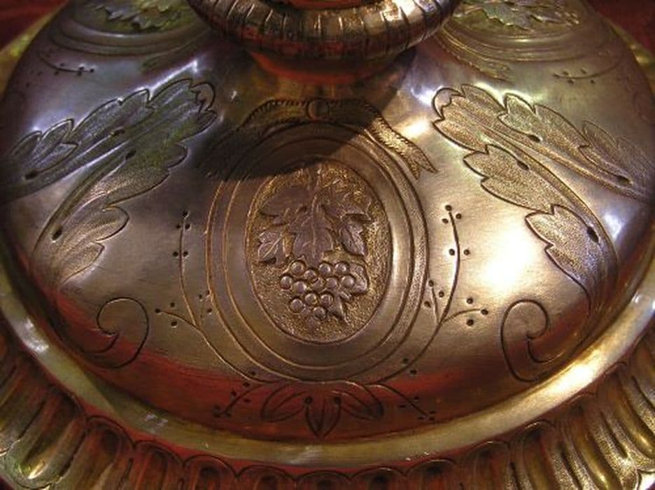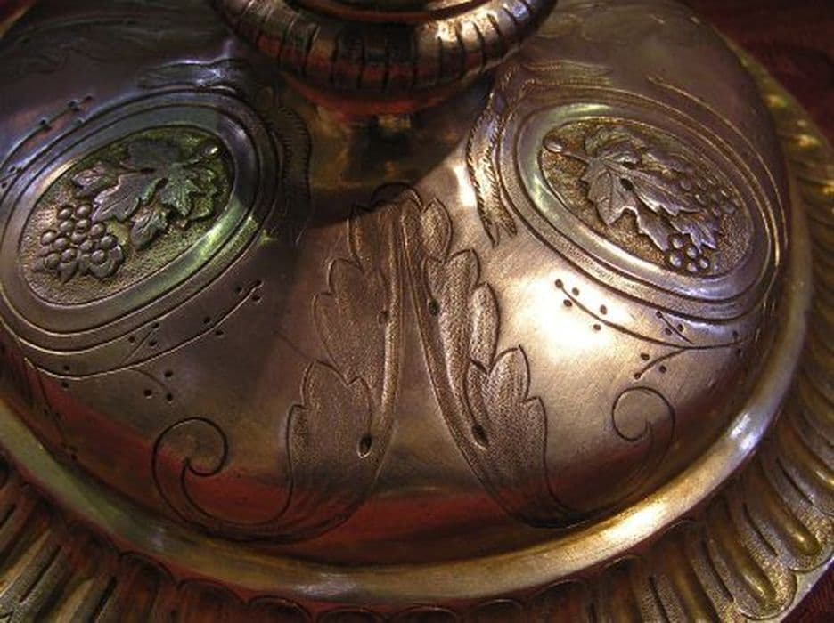 Ciboire en argent, anciennement doré. Pied circulaire au redent concave chargé de godrons en creux. Dessus bombé orné de trois grappes de raisin feuillées dans un médaillon ovale alternant avec des feuilles d’acanthe stylisées. Collerette basse striée. Noeud en forme d’urne décoré de godrons en creux à la base et de feuilles d’acanthe stylisées au sommet. Cuve semi hémisphérique aplatie lisse. Couvercle aux feuilles d’acanthe rayonnantes, bordé d’une bande de godrons en creux. Croix tréflée.