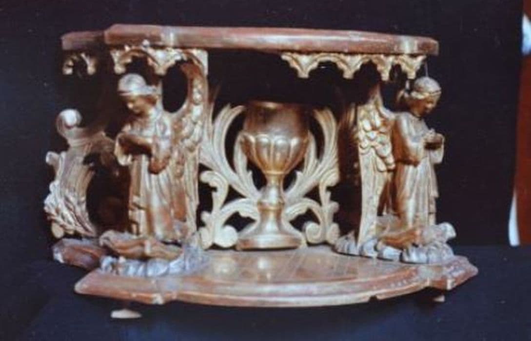 Base ovale à redents supportant quatre anges agenouillés en prière. Dessus ovale à redents à bord festonné.