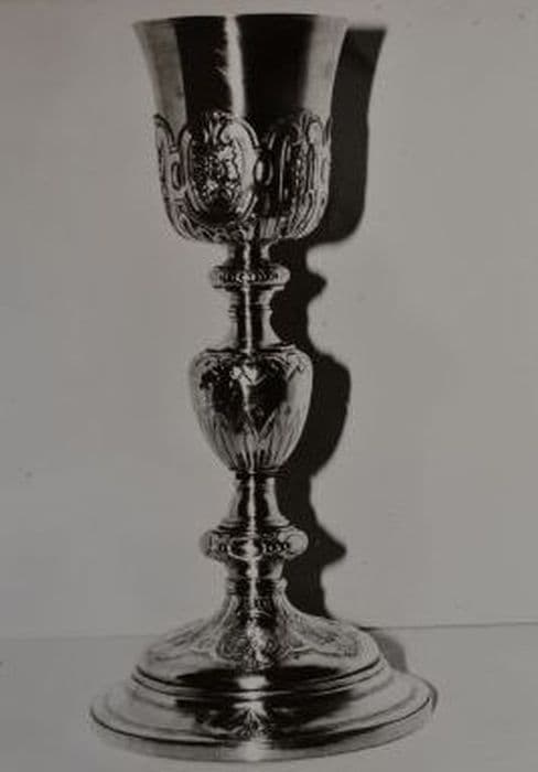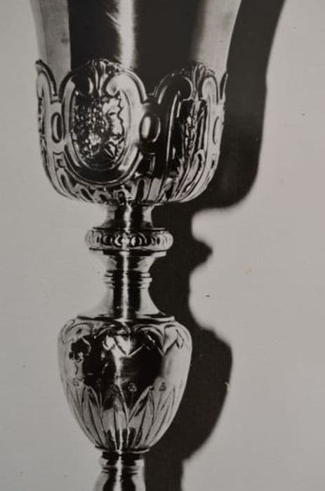 Calice en argent à décor gravé, coupe dorée. Fausse coupe ajourée à médaillons de raisins et de blé.