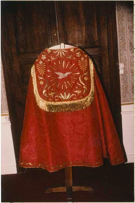 Chape en moire rouge. Orfrois et dosseret brodés en relief de fougères, de feuillages et de fleurs stylisées d'or. Passementerie et franges d'or. Doublure rouge.
