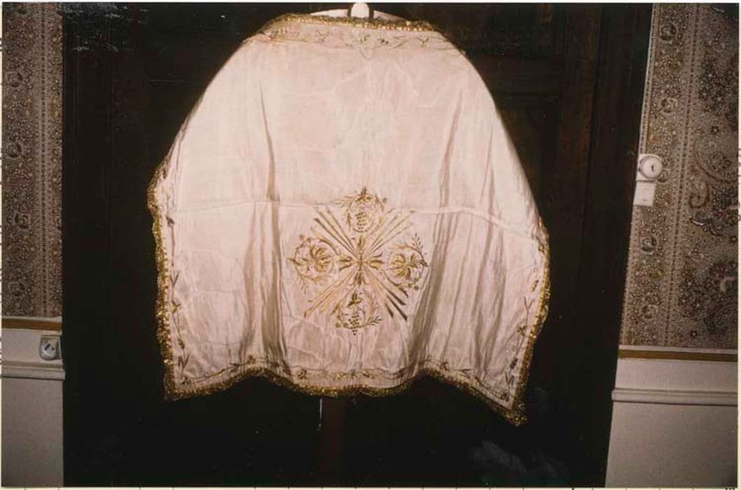 Voile huméral (ou du Saint Sacrement) en moire blanche, brodée d'or, avec doublure.