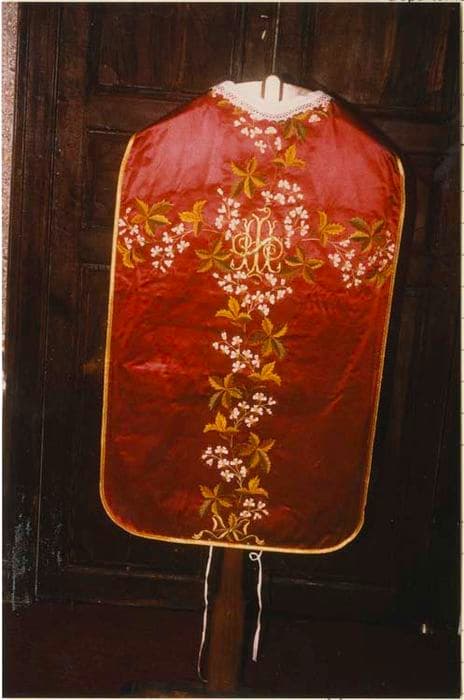Chasuble en soie unie rouge. Orfroi et croix peints à l'aiguille de fleurs de couleur rose et or. Doublure blanche.