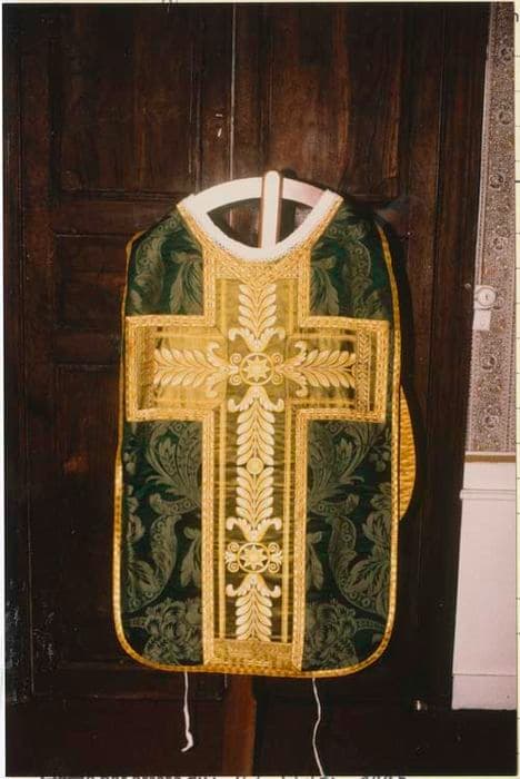 Chasuble en damas vert et doublure bouton d'or. Orfroi et croix en soie verte brochée de palmettes stylisées séparées par une étoile à huit branches, le tout encadré par une passementerie droite dorée.