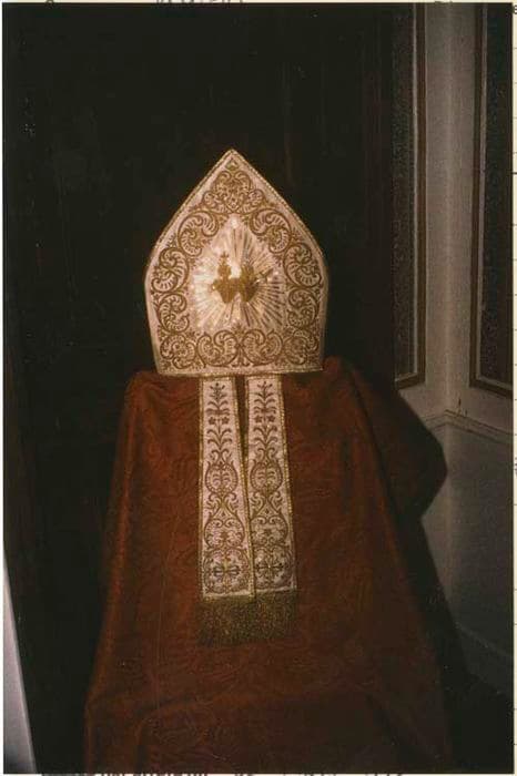 Mitre en soie blanche. Fanons chargés de broderies géométriques terminés par des palmettes.