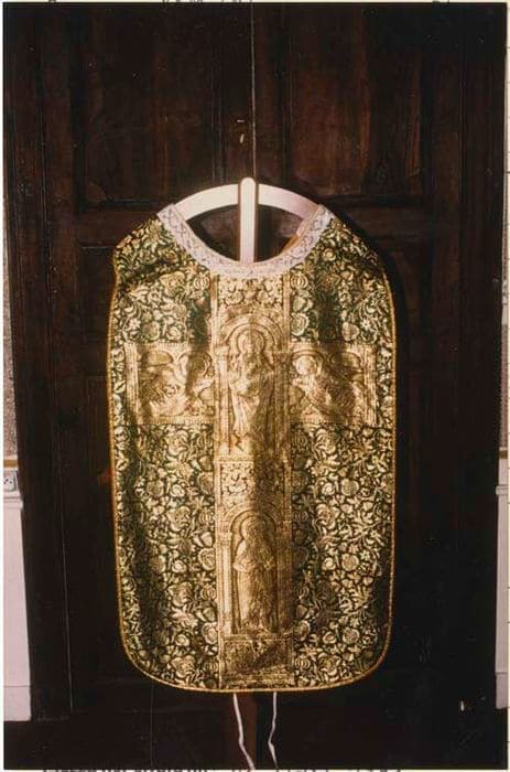 Chasuble en soie verte brochée de ramages de chardons d'or. Orfroi et croix à fond vert chargés de figurines d'or sous des arcatures. Doublure bouton d'or.