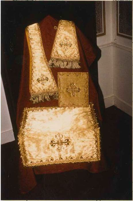 ornement liturgique : étole de clerc, voile de calice, manipule et bourse de corporal