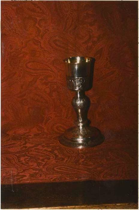 Calice en métal argenté. Pied rond redent nervuré, dessus bombé orné de six médaillons en relief. Collerette basse unie. Fût cannelé à la base, intégrant le noeud ovoïde décoré de six motifs double de clochette tombante en relief, séparés par une nervure. Fausse coupe ajourée de feuilles oblongues et de rubans plats formant une demi boucle. Coupe en forme de tulipe.