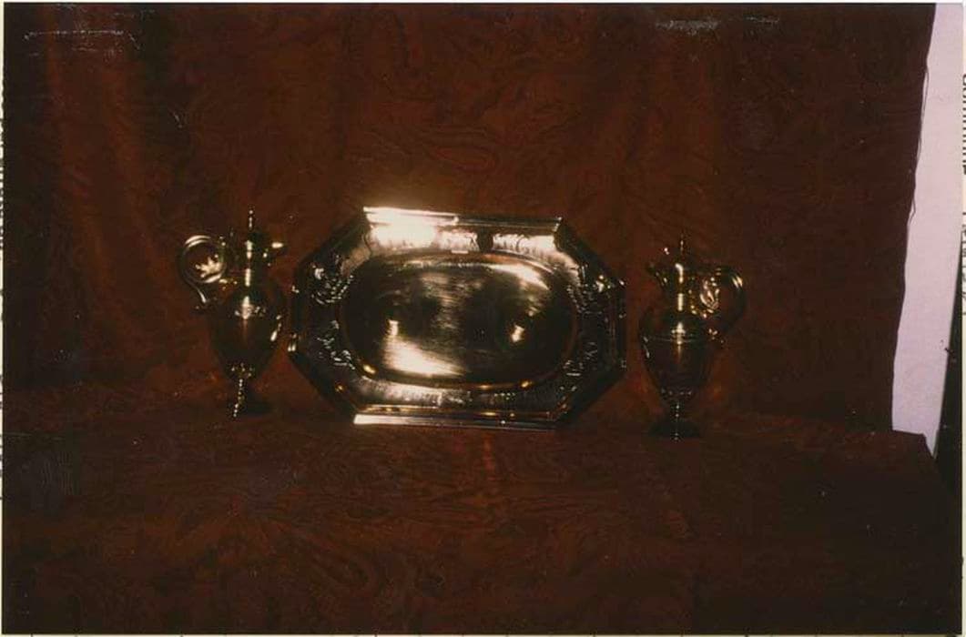 Plateau ovale avec marli décoré en chef d'armoiries et deux burettes en argent doré. Burettes sur pied à sept facettes, cuve oblongue, ceinture centrale gravée, anse en forme de volute terminée à la partie haute par une feuille d'acanthe et couvercle avec cabochon. Le plateau et les burettes sont protégés dans un coffret en bois.