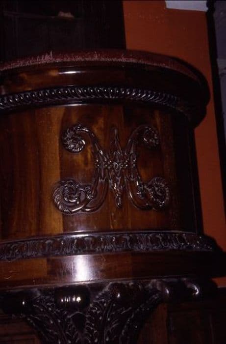 Chaire à prêcher ronde en bois ciré avec abat-voix.