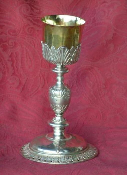 Calice en métal argenté, coupe en argent doré. Pied rond à rais de coeur ajourés. Noeud ovoïde à décor d’oves montantes et descendantes, entre deux collerettes plates unies. Fausse coupe à larges feuilles. Coupe en forme de tulipe.