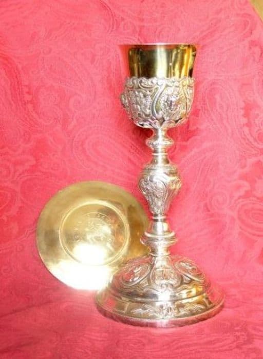 Calice en métal argenté, et coupe dorée, accompagné de sa patène en métal doré. Pied rond, bordure décorée d'ovales cantonnés par deux cannes de roseaux. Dessus bombé chargé de trois médaillons ovales entourés de perles. Noeud ovoïde décoré de trois motifs : sarment de vigne fruité, bouquet d’épis de blé, masses de roseaux, entre deux collerettes gravées d’oves. Fausse coupe ajourée de feuilles soutenant trois motifs : sarment de vigne fruité, bouquet d’épis de blé, masses de roseaux. Coupe à la bordure évasée.