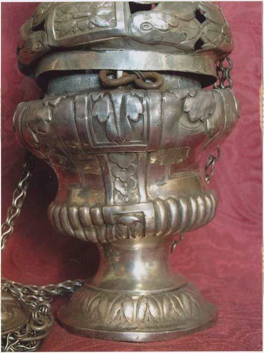 Encensoir en argent. Pied rond décoré de feuilles d’eau. Cuve en forme d’urne bordée de godrons et ornée de quatre motifs dans un cartouche rectangulaire, la partie haute ornée de feuilles stylisées. Cheminée ajourée avec un décor de feuillage en volute et trois bandes formant cartouche chargées d’une natte de feuillage. Partie haute constituée en couronne ajourée, le tout sommé d’une flamme.