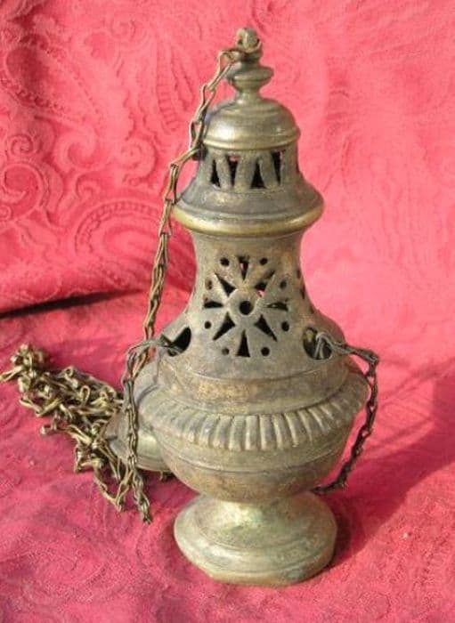 Encensoir en laiton. Pied rond uni, dessus décoré sur la bordure. Cuve unie terminée par de larges godrons en saillie. Cheminée à deux étages, ajourée en partie basse d'une rosace et en partie haute d'ouvertures angulaires, le tout terminé par un bouton.