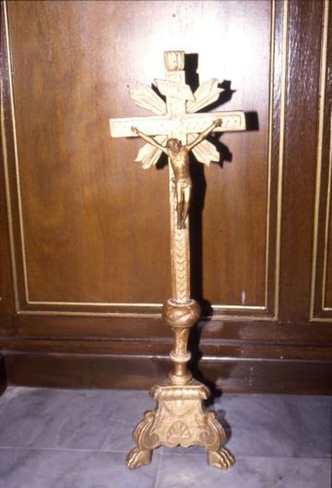 Croix d’autel en bois doré sur pied tripode à pattes de lion, surmontées de trois volutes encadrant des motifs religieux. La partie inférieure du fût circulaire est composée de trois feuilles. Croix latine chargeant des rayons posés en sautoir.