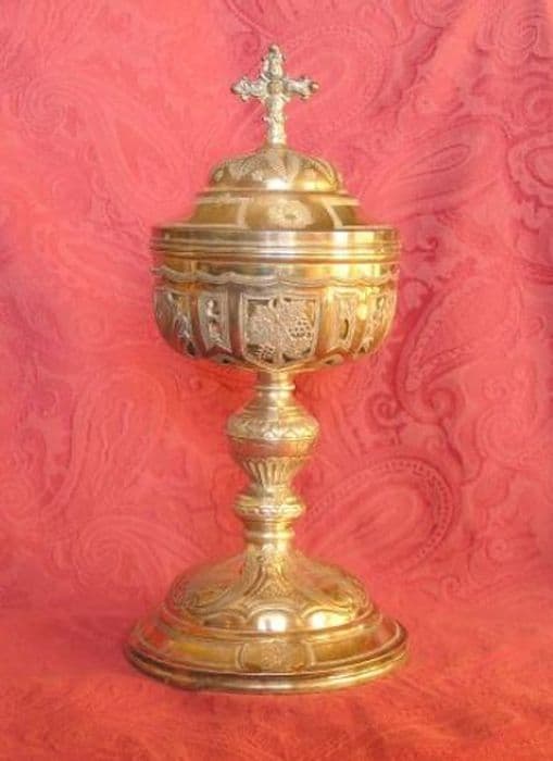 Ciboire en argent, doré à l'intérieur de la cuve. Pied rond uni chargé de trois rosaces. Dessus bombé avec motifs en relief baroques : épis de blé, sarment de vigne, masses de roseaux. Collerette basse ornée d’oves posées en largeur. Noeud en forme de poire, décoré. Fausse coupe ajourée avec trois palmes stylisées séparées par trois motifs : épis de blé, sarment de vigne, masses de roseaux. Couvercle décoré en bordure de trois cartouches unis séparés par trois rosaces à huit pétales, dessus bombé orné de palmettes, émergeant du centre, d’où sort une tige terminée par trois boules posées en triangle. Croix fleurie bourdonnée.