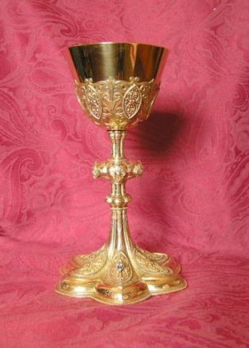 Calice et sa patène en argent doré, dans un coffret parallélépipédique en bois recouvert de tissu noir, tapissé de soie rouge. Calice sur pied sextilobe. Dessus granulé avec un gros et un petit diamant (provenant d’un pendentif). Fût à six côtés. Collerette basse très fine perlée, dessus redenté. Noeud à quatre ressauts. Fausse coupe ajourée avec six médaillons de grènetis. Coupe évasée.