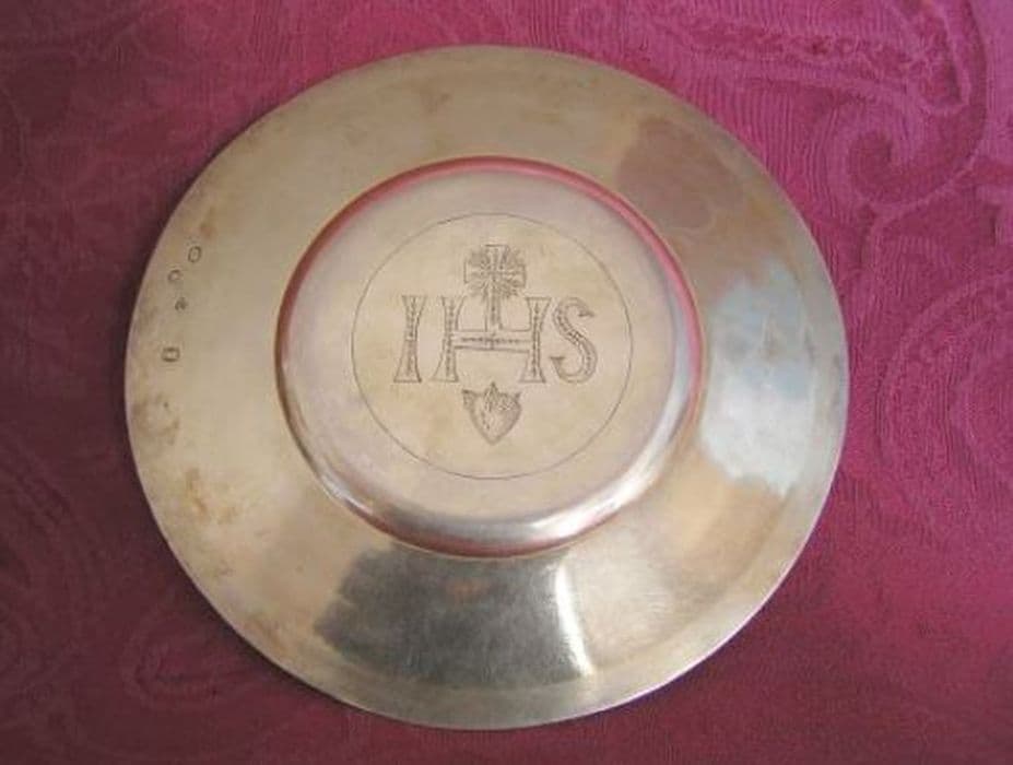Patène gravée du monogramme du Christ, sommé d'une croix latine rayonnante et soutenu par un coeur transpercé en chef de trois clous.