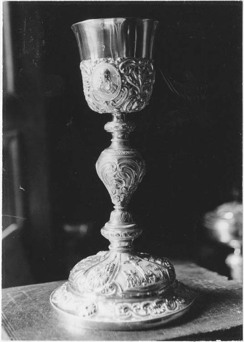 Calice en argent, doré à l'intérieur de la coupe dorée. Pied circulaire bordé d’un filet perlé, redent décoré de trois rosaces séparées par trois motifs de rinceaux émanant d’une coquille. Dessus bombé chargé de trois décors de grappes de raisin séparés par trois scènes de la vie du Christ. Collerettes basse et haute ornées de perles. Noeud ovoïde à trois rosaces entourées d’un décor baroque. Coupe évasée.