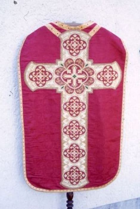 Chasuble en damas rouge. Orfroi et croix à redents pattée en tapisserie à fond blanc crème bordé de caramel, portant des quadrilobes rouges chargés en coeur d'une croisette soulignée de beige et entourée de ramages d'or. Passementerie de soie dorée à la rosace boutonnée de rouge. Doublure jaune d'or. Etole, manipule et voile de calice assortis avec croix aiguisée de passementerie, franges d'or et doublure jaune d'or.