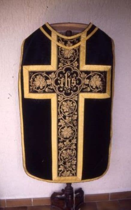 Chasuble en satin noir uni avec orfroi et croix dessinés par passementerie ondulée à lignes brisées d'or. Décor de rinceaux de feuillages et de fleurs stylisées d'or. Doublure noire. Deux étoles, trois manipules de forme triangulaire, voile de calice et pluvial (chape) en satin noir uni, assorti à la chasuble, avec broderies de passementerie, croix aiguisée de passementerie, doublure noire et franges d'or.