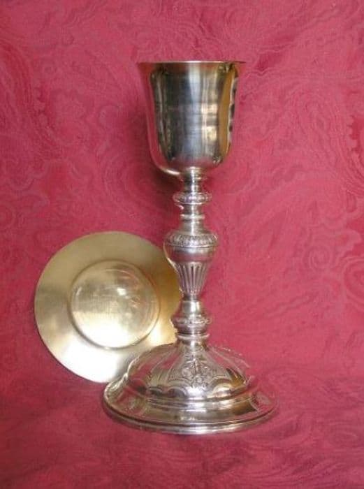 Calice en argent, doré à l'intérieur de la coupe. Pied circulaire à redent concave chargé de trois cartouches vierges séparés par trois fleurettes à quatre pétales. Dessus fortement bombé frappé de décors dans des cartouches baroques : croix de calvaire rayonnante sur des nuées, cep de vigne feuillé et fruité, épis de blé, alternant avec une masse de roseau. Collerettes basse et haute frappées d’oves. Noeud piriforme à longues nervures sur la partie basse et frise de feuilles d’eau au sommet. Fine collerette striée. Coupe lisse à bord évasé.