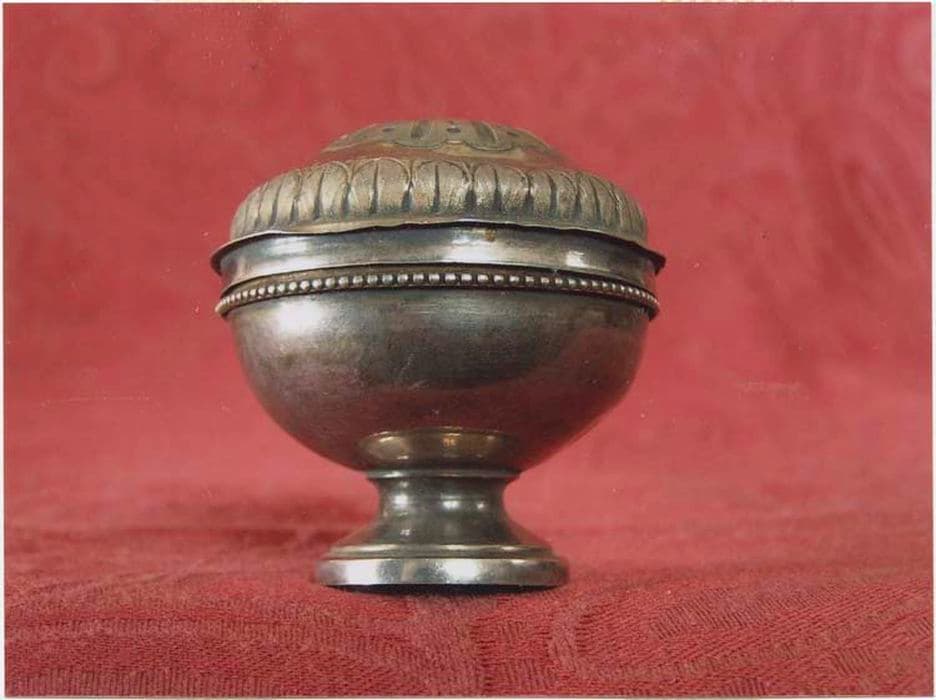 Ciboire des malades en argent, dit pyxide. Base circulaire lisse. Cuve lisse bordée d’un filet perlé. Couvercle en léger chapeau de gendarme bordé d’une frise de feuilles d’acanthe ; cœur circulaire strié rayonnant de traits réguliers.