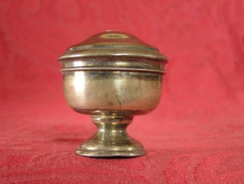 Ciboire des malades en argent, dit pyxide. Base circulaire lisse. Cuve lisse bordée d’un filet perlé. Couvercle bombé lissé bordé d’une frise striée.