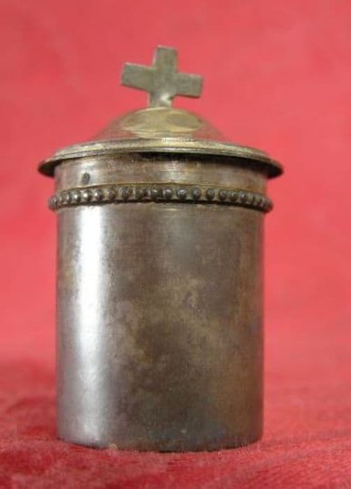 Ampoule (dite chrémeau) en argent. Fût cylindrique lisse à la bordure perlée au sommet. Couvercle à chapeau de gendarme bordé d’un filet perlé gravé. Croix latine simple.