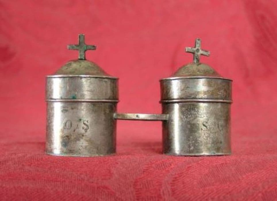 Ampoule (dite chrémeau double) en argent. Base circulaire. Fût cylindrique lisse. Couvercle avec rehausse en chapeau de gendarme. Croix latine simple.