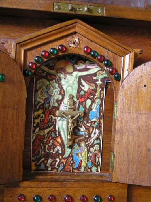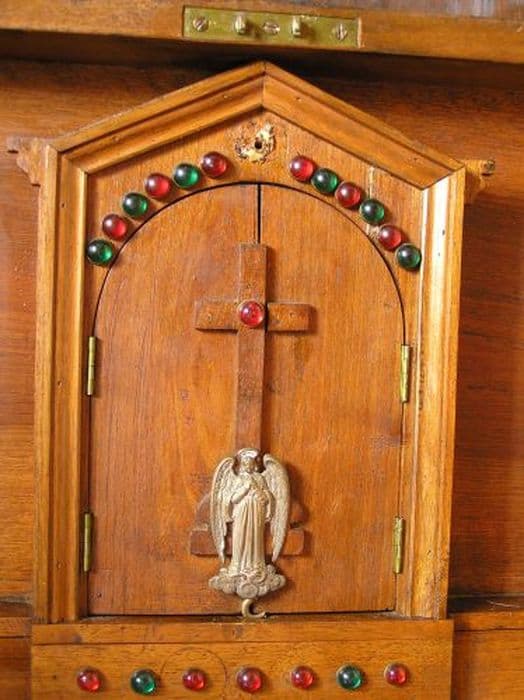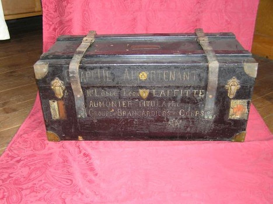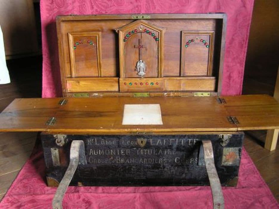 Cantine en bois renforcée avec coins en laiton et attaches en cuir. Aménagement d'un autel portatif avec bac pour recevoir les objets du culte et les ornements liturgiques.