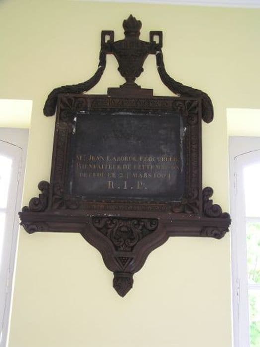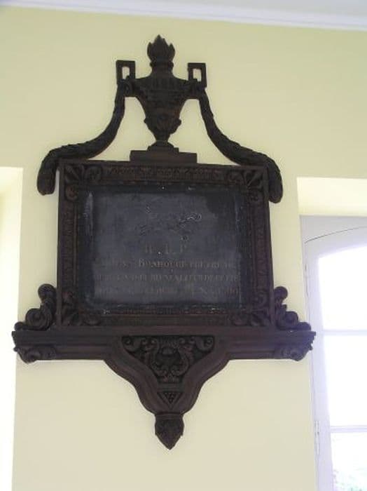 Plaques de donateur en marbre noir avec lettrines dorées dans encadrement rectangulaire en stuc couleur bois.