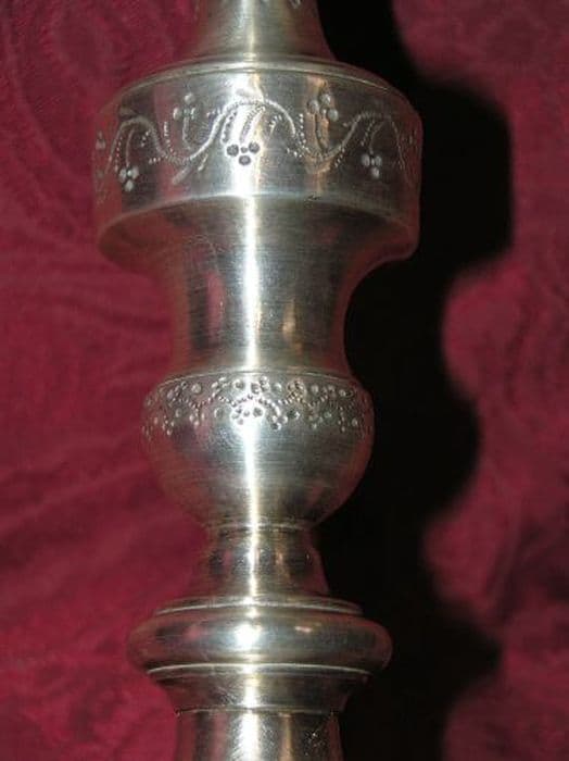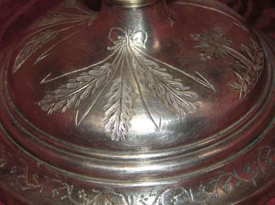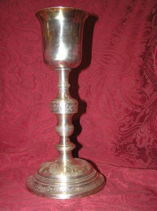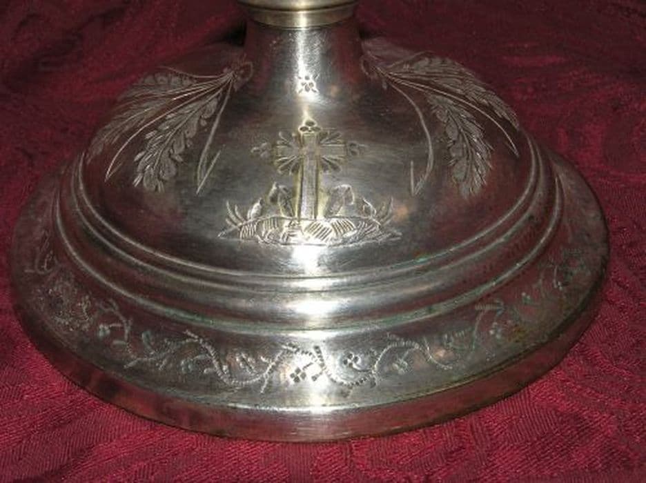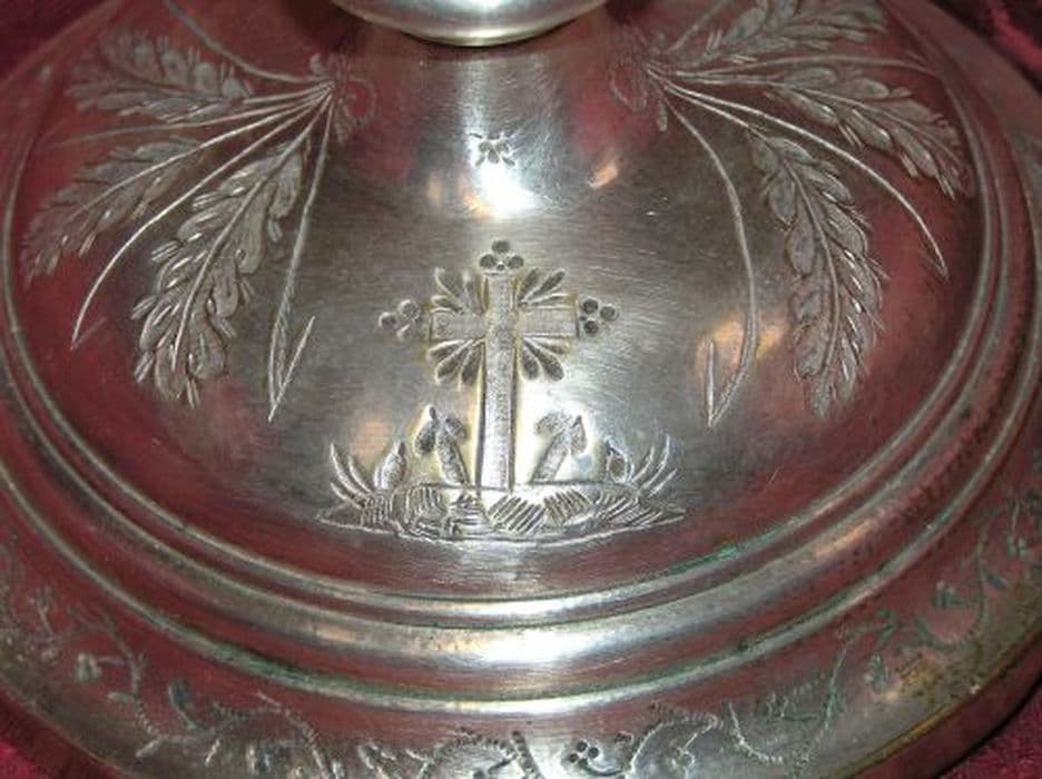 Calice en laiton argenté, et argent doré à l'intérieur de la coupe. Pied circulaire à redent concave gravé d’une guirlande de rinceaux. Dessus bombé gravé d’une croix de calvaire au pied fiché, rayonnante et de bouquets d’épis de blé. Collerette basse lisse. Noeud en forme d’urne, base gravée de petits rinceaux, haut formé par une large bande gravée de rinceaux. Petite collerette haute soulignée de part et d’autre par des motifs gravés. Coupe à bord évasé.